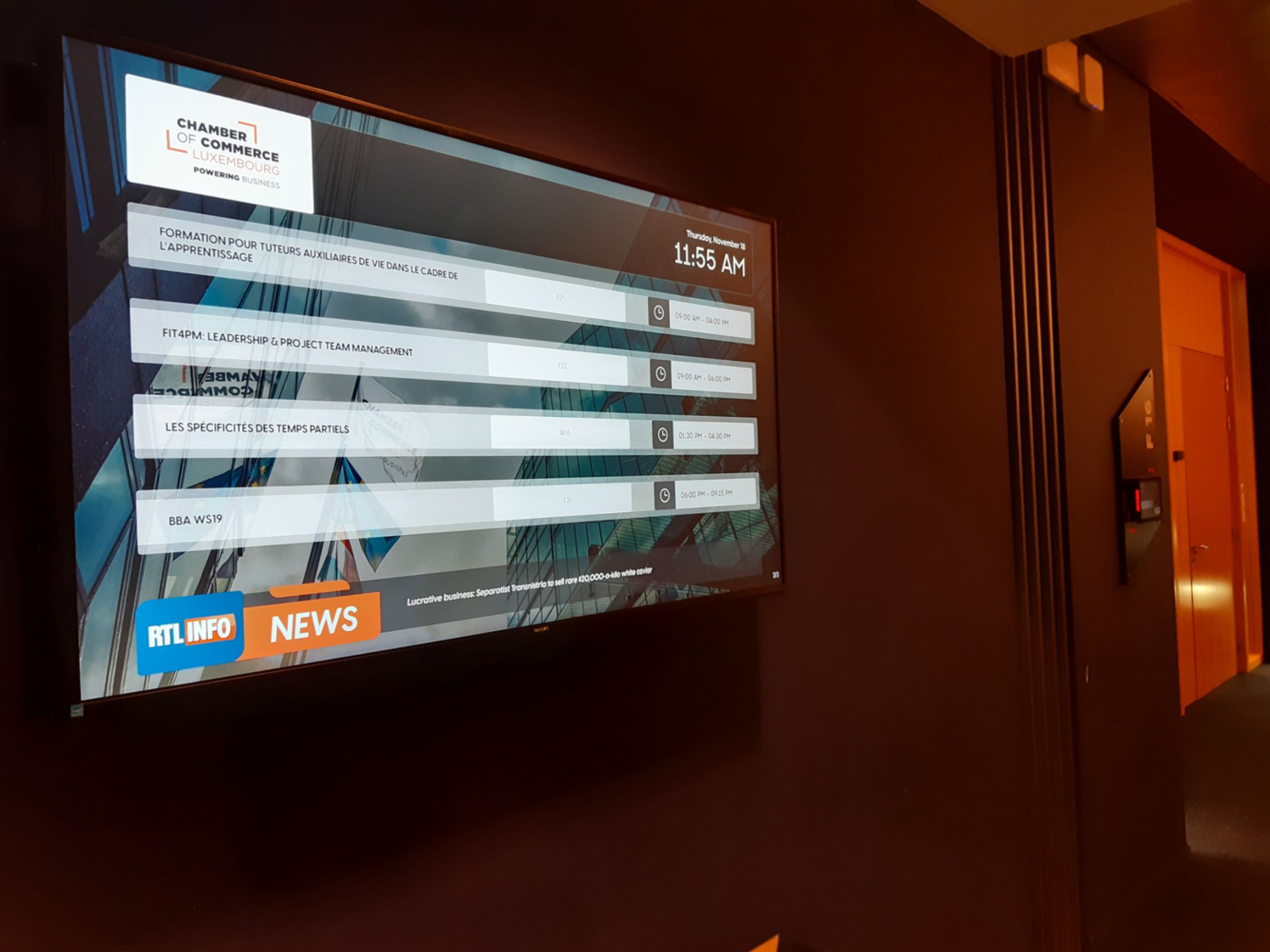 La Chambre de commerce désirait repenser son système de salles de réunion afin de permettre une vue rapide et efficace des salles disponibles ainsi que les formations qui y sont dispensées. L’objectif était une meilleure qualité et une transmission optimisée de l’information par un affichage en salle, mais également dans le hall d’accueil ou sur PC.