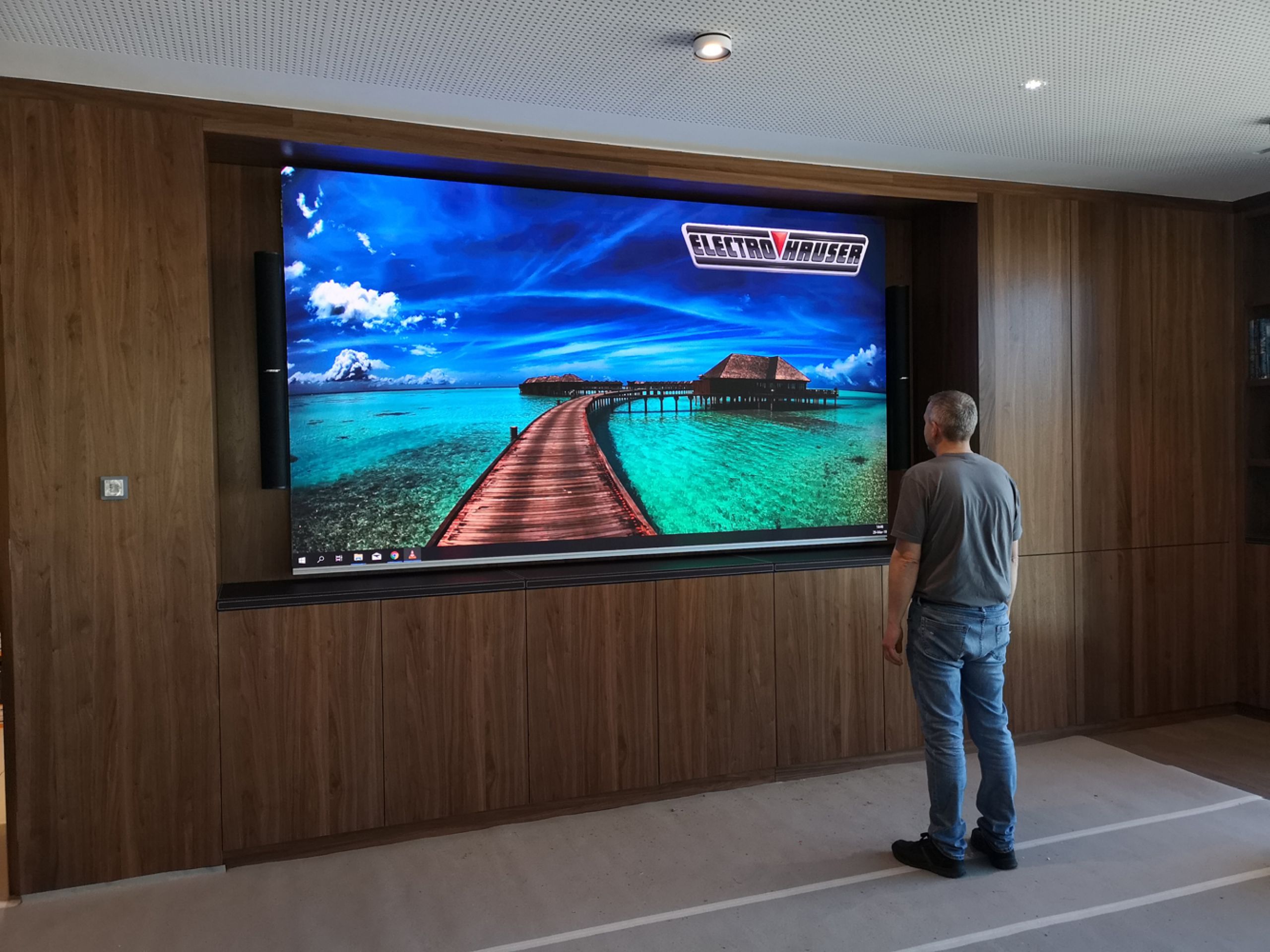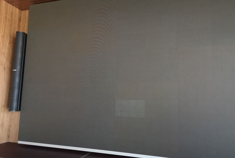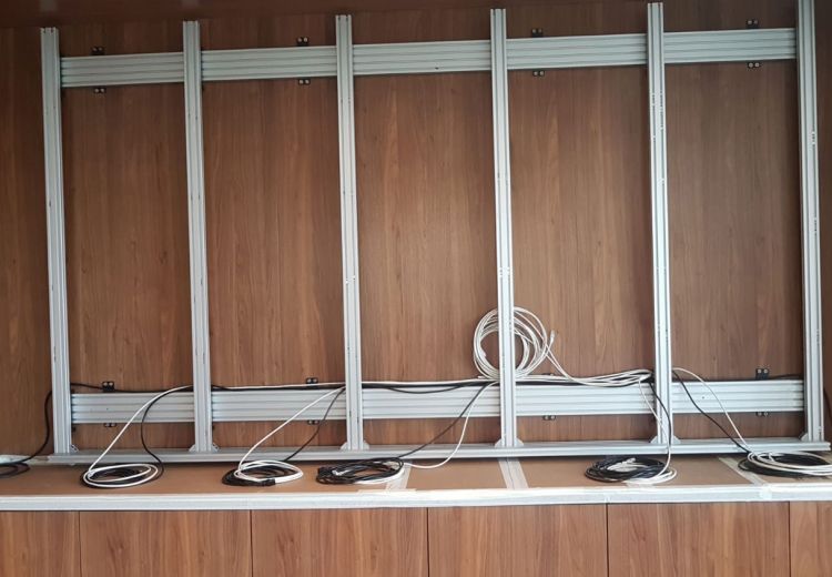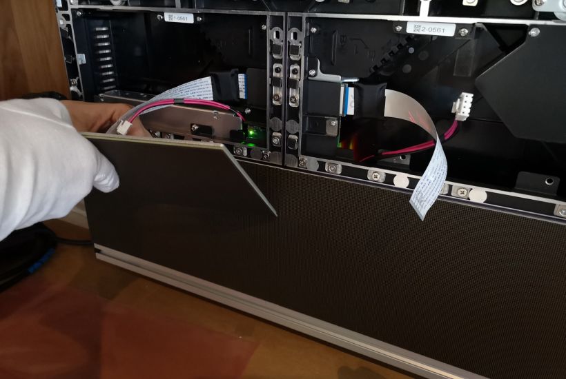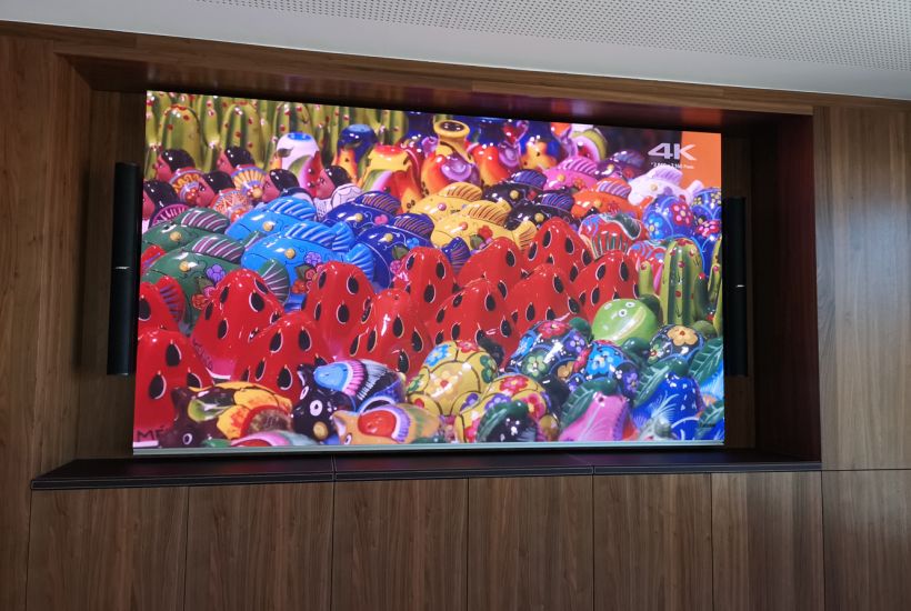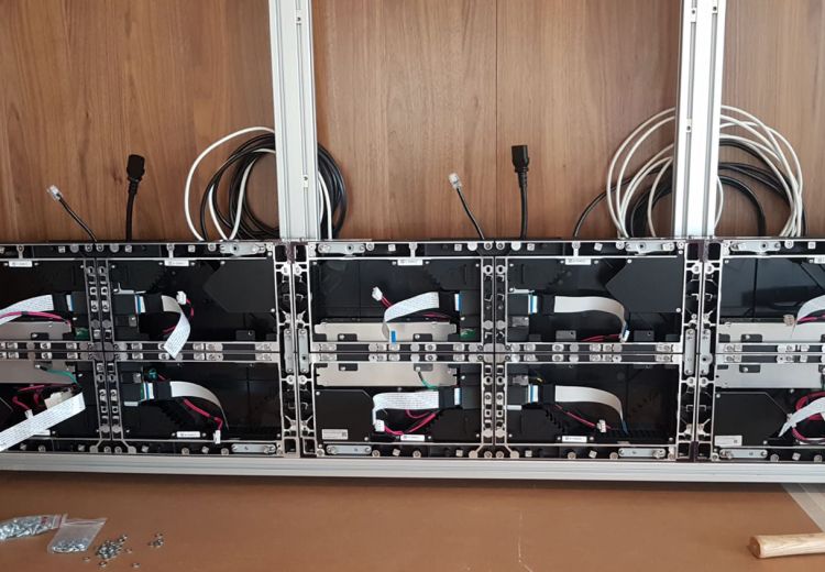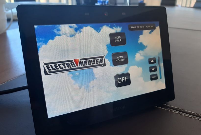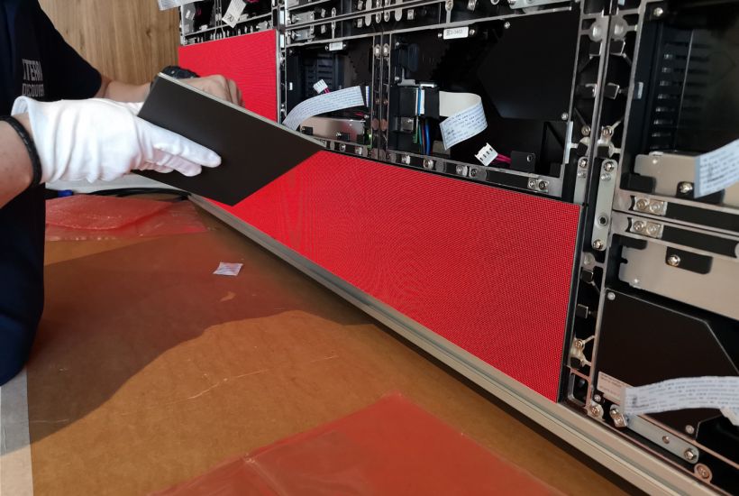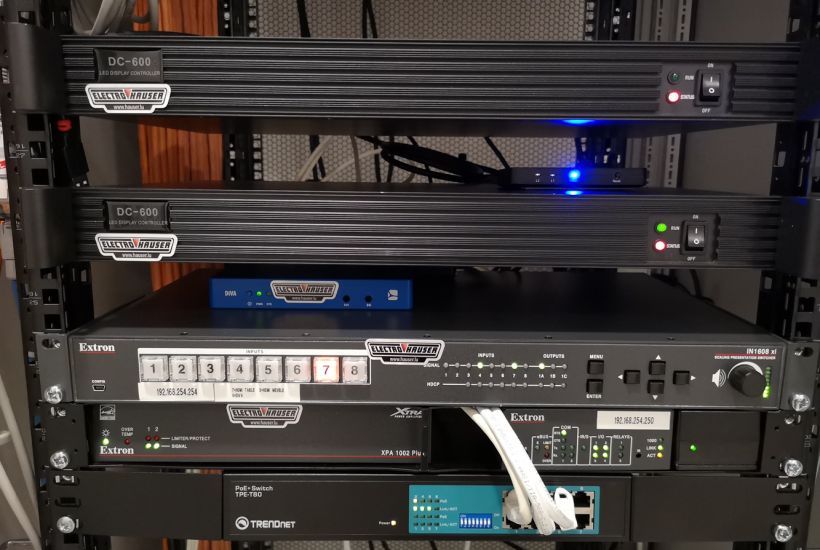 Pour remédier à cette situation pour le moins complexe, nous avons analysé les différentes options techniques á notre disposition, mais également l’agencement général et le type de mobilier présent. Nous avons opté pour la mise en place d’un vidéo wall full LED très lumineux sur-mesure completement en accord avec mobilier existant. Les sources video et audio sont gérées par un panel soft touch repris sur réseau IT, la pose des processeurs vidéo est faite dans une régie annexe.